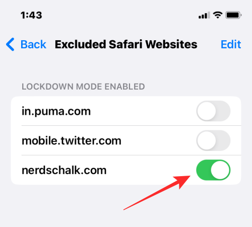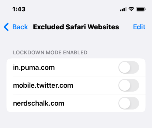如果您已排除某些网站不受ios锁定模式的影响,则可以在iphone上的锁定模式设置中查看它们。排除列表中的网站可以使用锁定模式启用,也可以将其永久删除,使其不再显示在排除列表中。