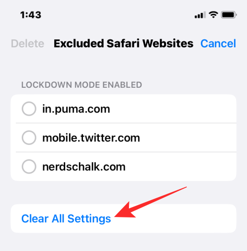 - 在这里,您可以通过点击清除所有设置来清除所有网站的锁定模式设置。这将从排除列表中删除所有列出的网站。